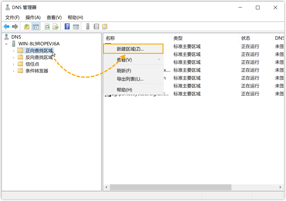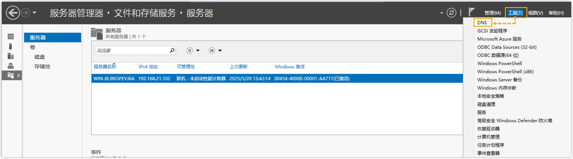 - 在 Windows Server 的服务器管理器窗口右上角,点击 ,打开 DNS 管理器。