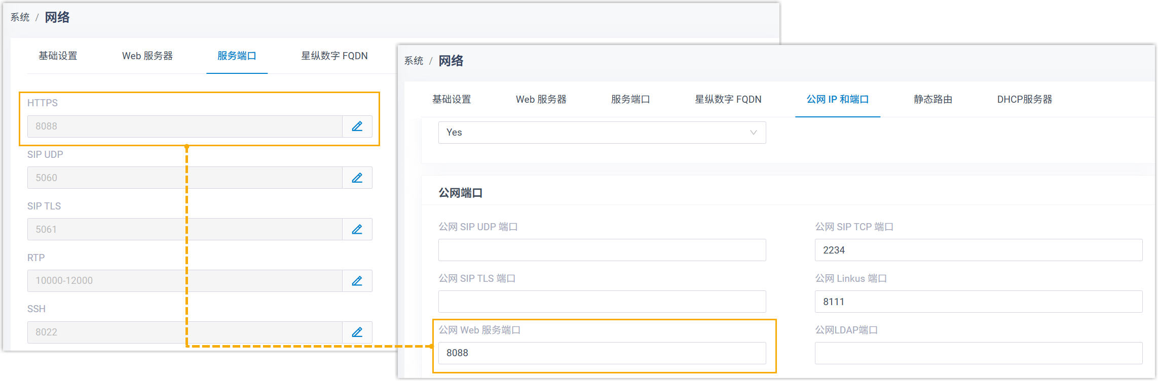 - 对于公司内部网络中的用户,域名会解析到 PBX 系统的私网 IP 地址 (如