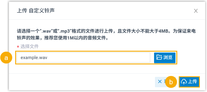 .wav或.mp3提示: 如果音频文件格式不符合要求,你可以通过 G711在线转换器或 WavePad 转换文件格式。 - 文件大小:最大 4 MB注: 为保证来电铃声的效果,建议使用的音频文件不超过 1 MB。