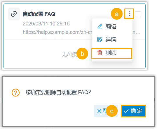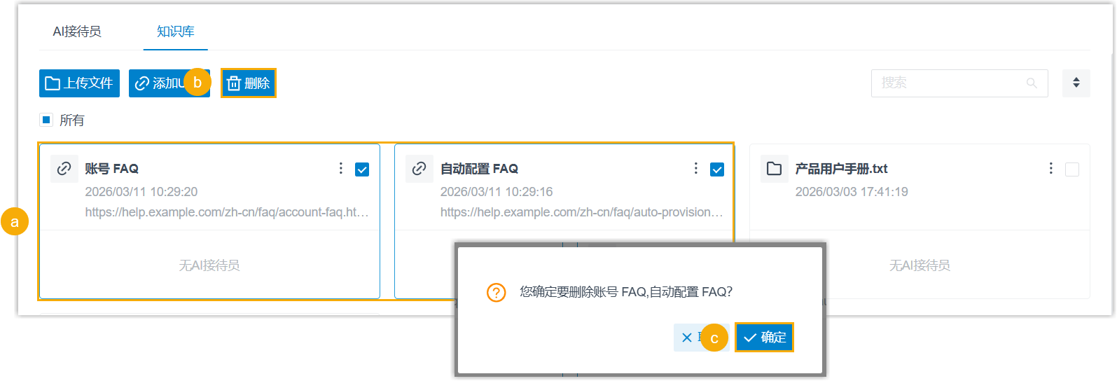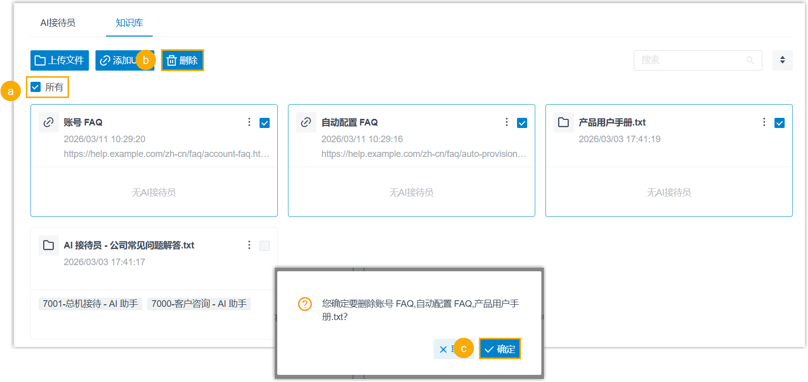 注: 不支持删除已分配给 AI 接待员的内容条目。