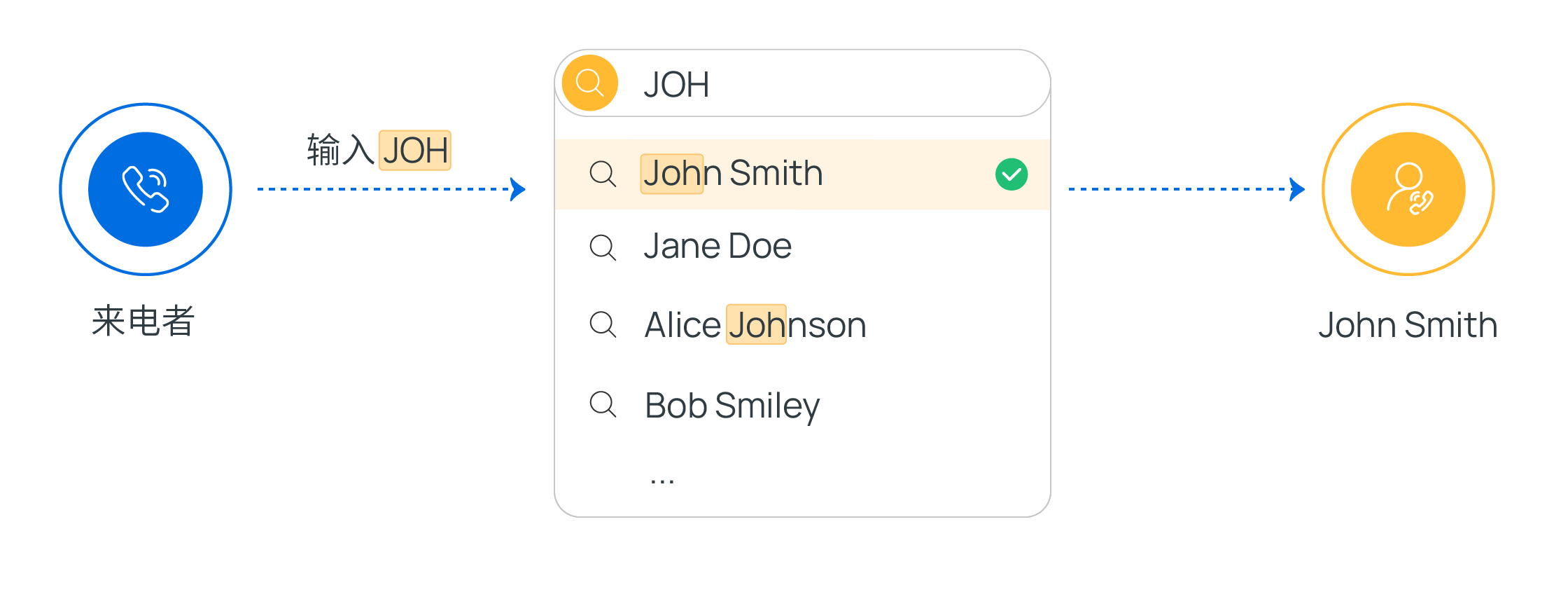- 如果来电者按 *,系统会继续查找下一个匹配项并播放提示语。若无更多匹配项,系统播放提示语“没有您想要查找的信息”。
