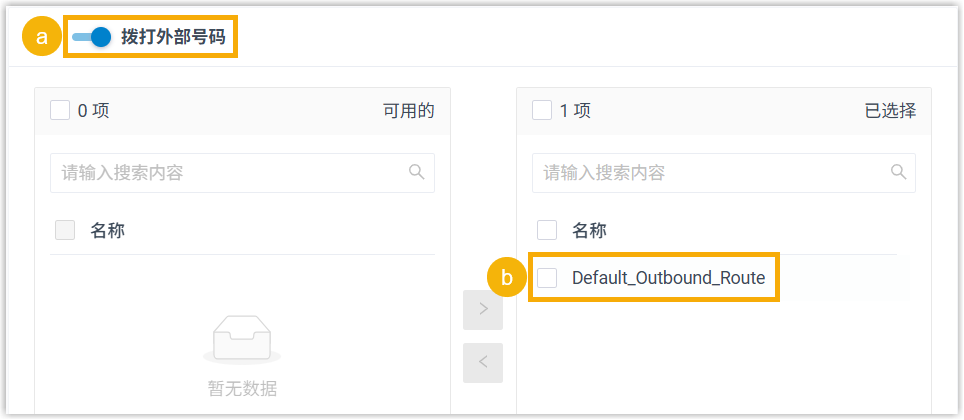 - 将允许的呼出路由从 可用的 框添加到 已选择 框。
