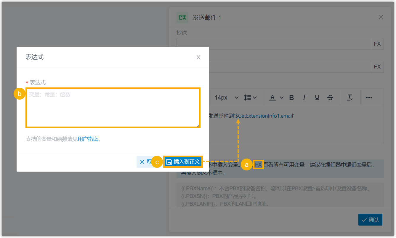 正文 填写邮件正文内容。 注: 支持使用变量插入通话或系统相关信息。- 如需插入通话相关信息,点击