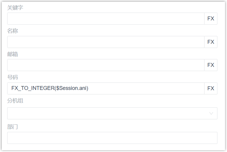 配置表达式。分机组 选择分机组,系统将在所选分机组中搜索。 注: 若未指定,系统将在所有分机组中搜索。部门 选择部门,系统将在所选部门中搜索。 注:- 仅当启用 部门管理 功能 (路径:) 时才显示此项。