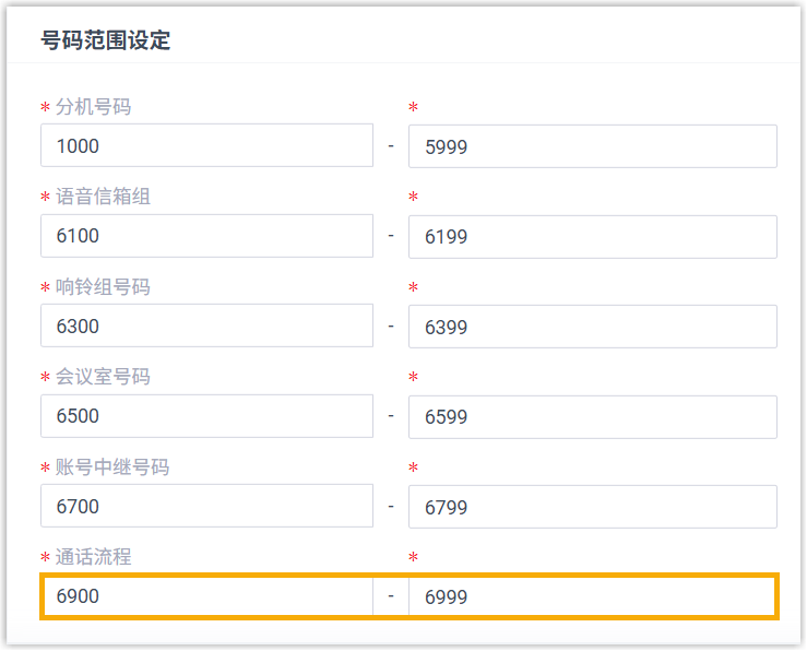 项目 说明 号码 保留默认的分机号码,或自定义一个号码。 注:- 自定义号码可以不在默认范围 (6900 - 6999 / 50900 - 50999) 内。