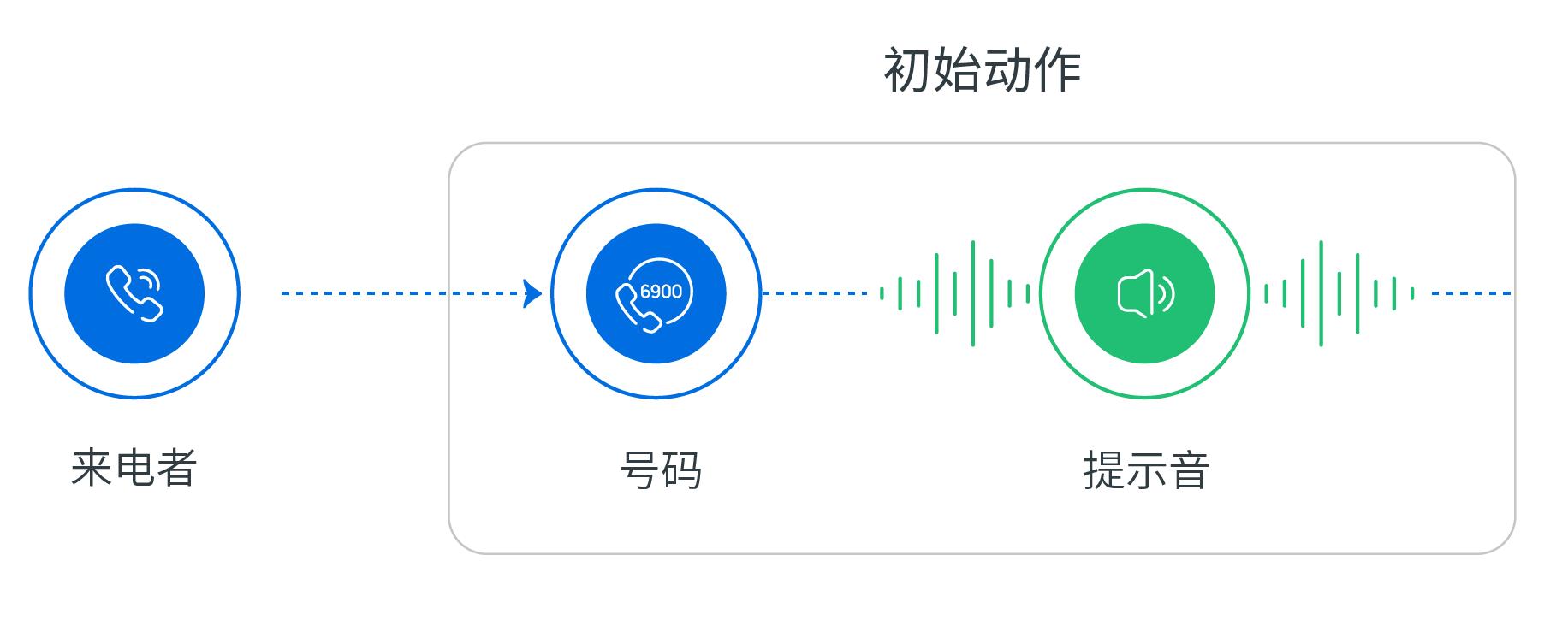 初始动作 组件是通话流程的起点,用于指定可进入该通话流程的号码,并支持设置提示音,以播放欢迎信息或提供操作指引。