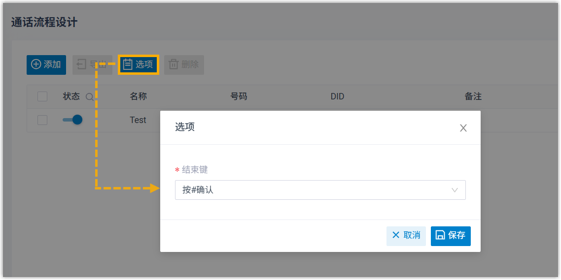 你可以进入 通话流程设计 > 选项 中设置结束键。