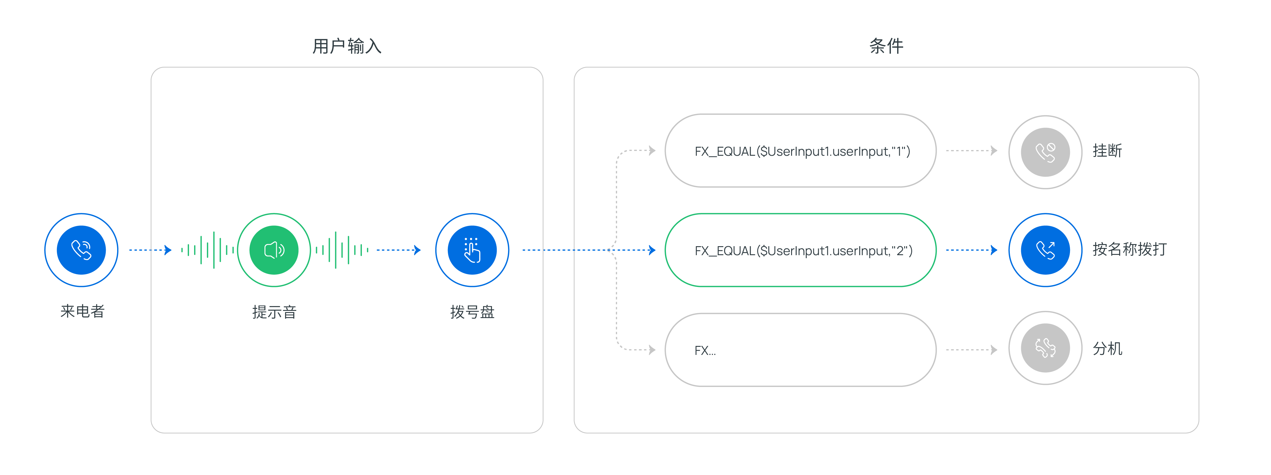 在通话流程中添加 用户输入 组件后,系统会将来电者的按键输入存储至变量中。这些变量可以在支持表达式的组件中 (如 条件 组件、开发者 组件) 调用,从而根据按键输入结果动态处理来电。