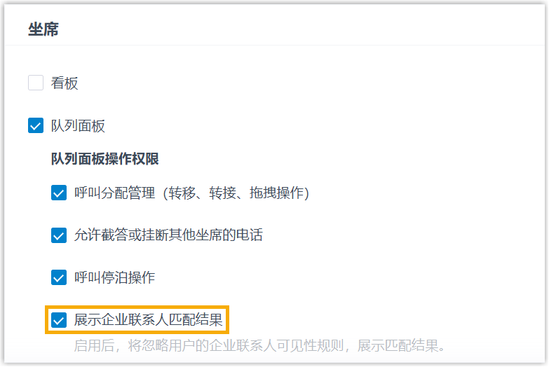 要允许坐席在收到企业联系人的队列来电时,在队列面板查看联系人的姓名,你需要为特定队列的坐席分配相应的队列面板权限,并配置企业联系人匹配规则。