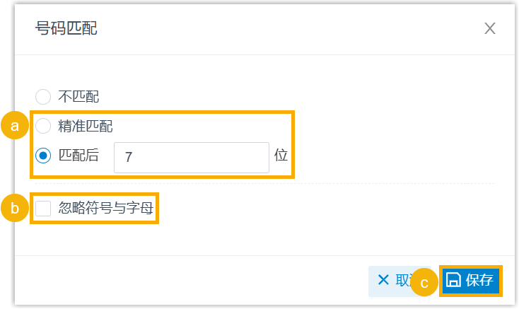 注: 默认值为 7。你可以填写 4 到 31 之间的数字。 - 可选: 如需在匹配联系人时自动忽略号码中的符号和字母,勾选 忽略符号与字母。