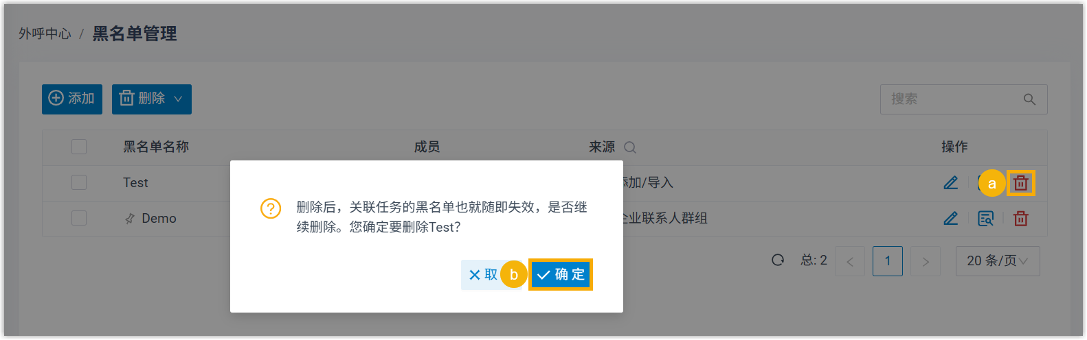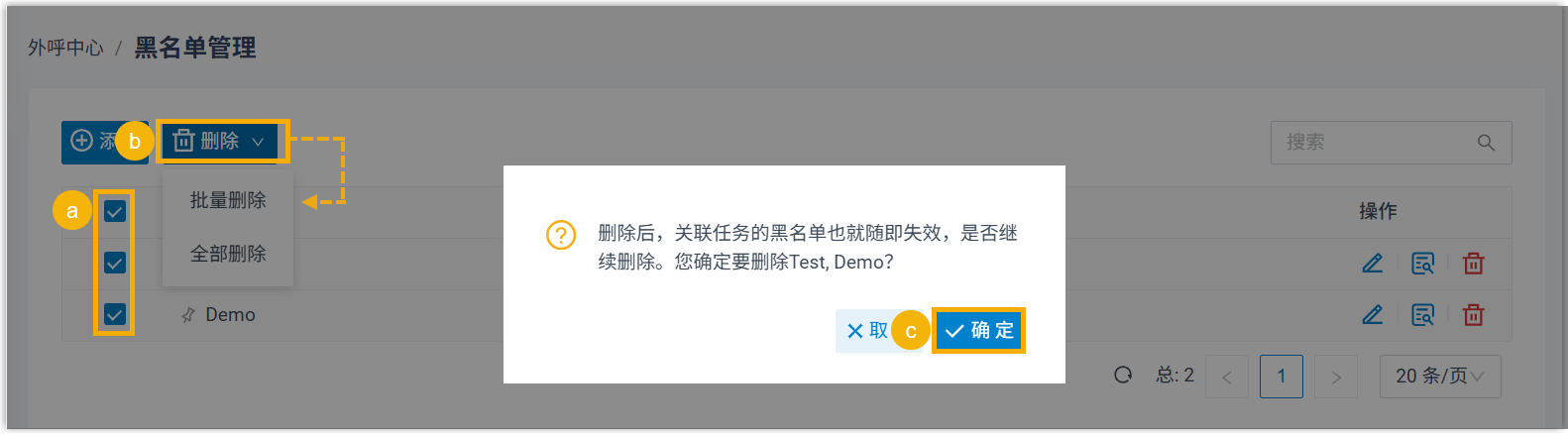 注: 黑名单如果已关联至尚未结束的外呼任务,且允许坐席添加联系人,则只能在任务结束后删除。