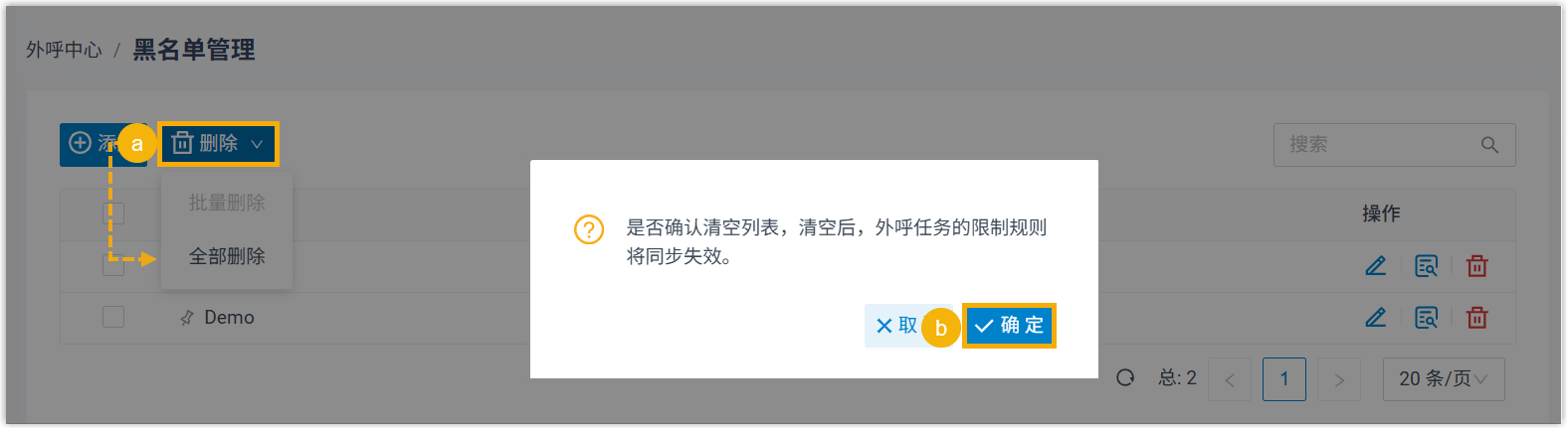 场景 说明 删除单个外呼黑名单