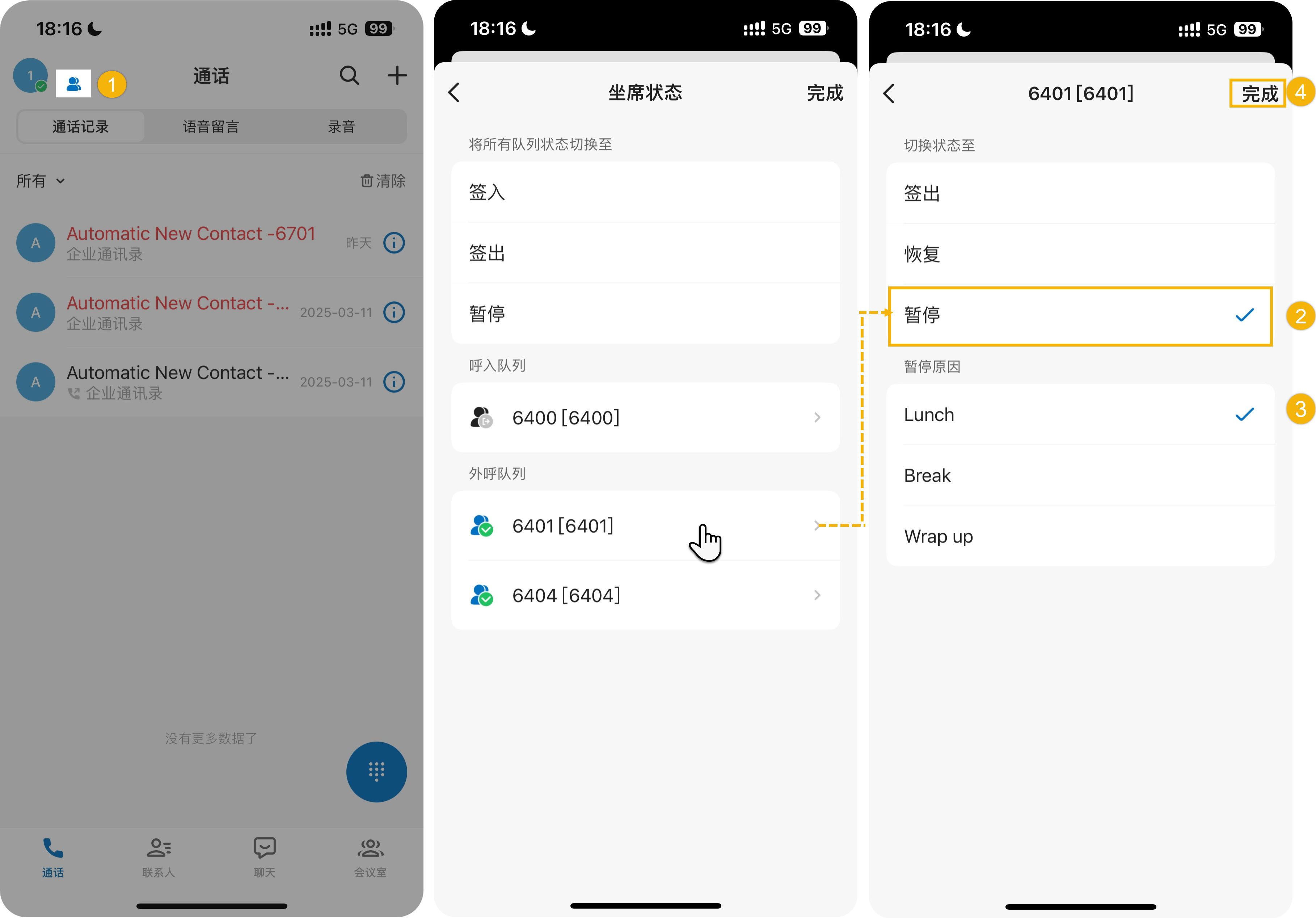 使用特征码暂停接收指定队列来电 - 从系统管理员处获取 暂停/恢复 特征码以及 暂停原因 特征码。