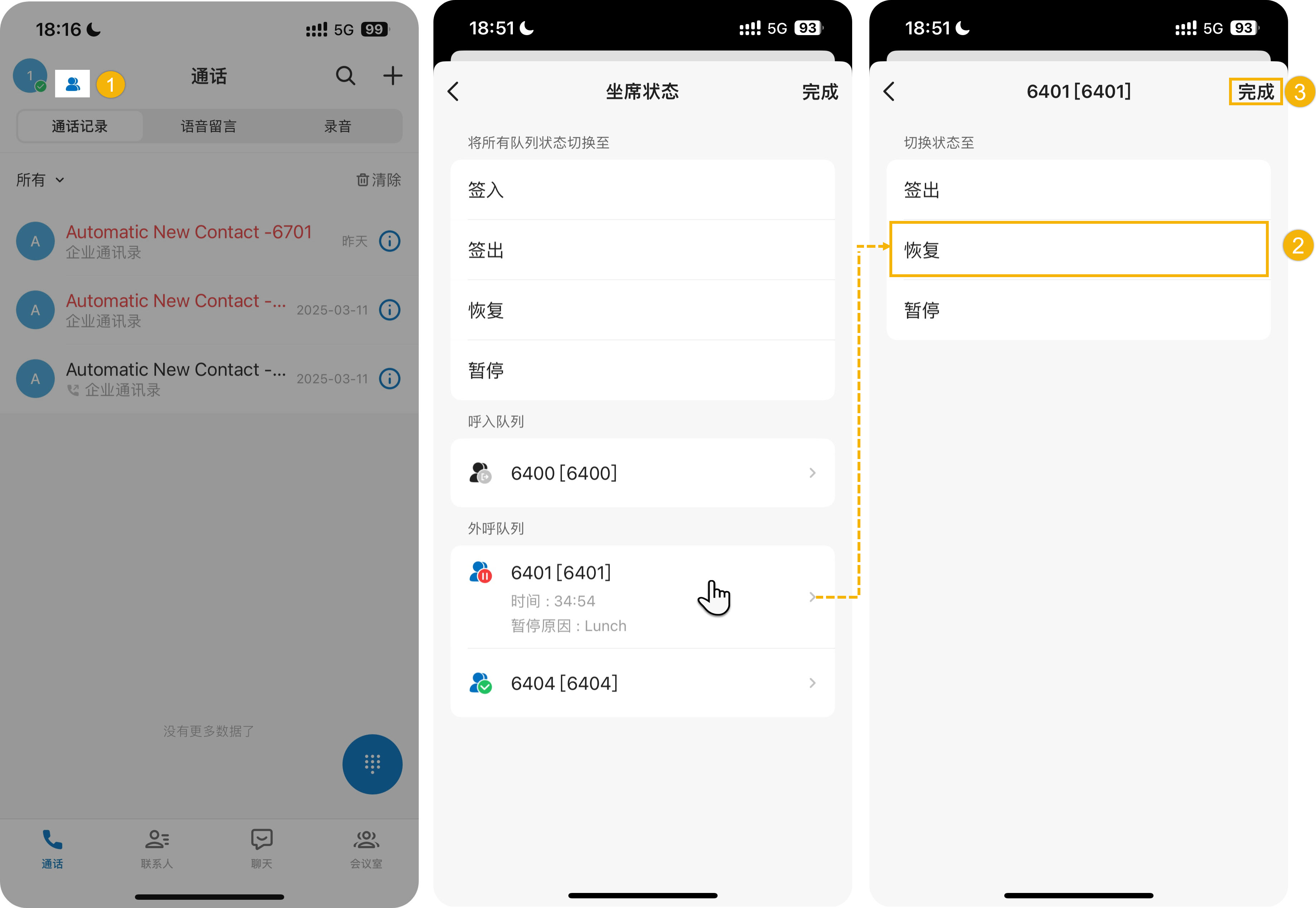 使用特征码恢复接收指定队列来电 - 从系统管理员处获取 暂停/恢复 特征码。
