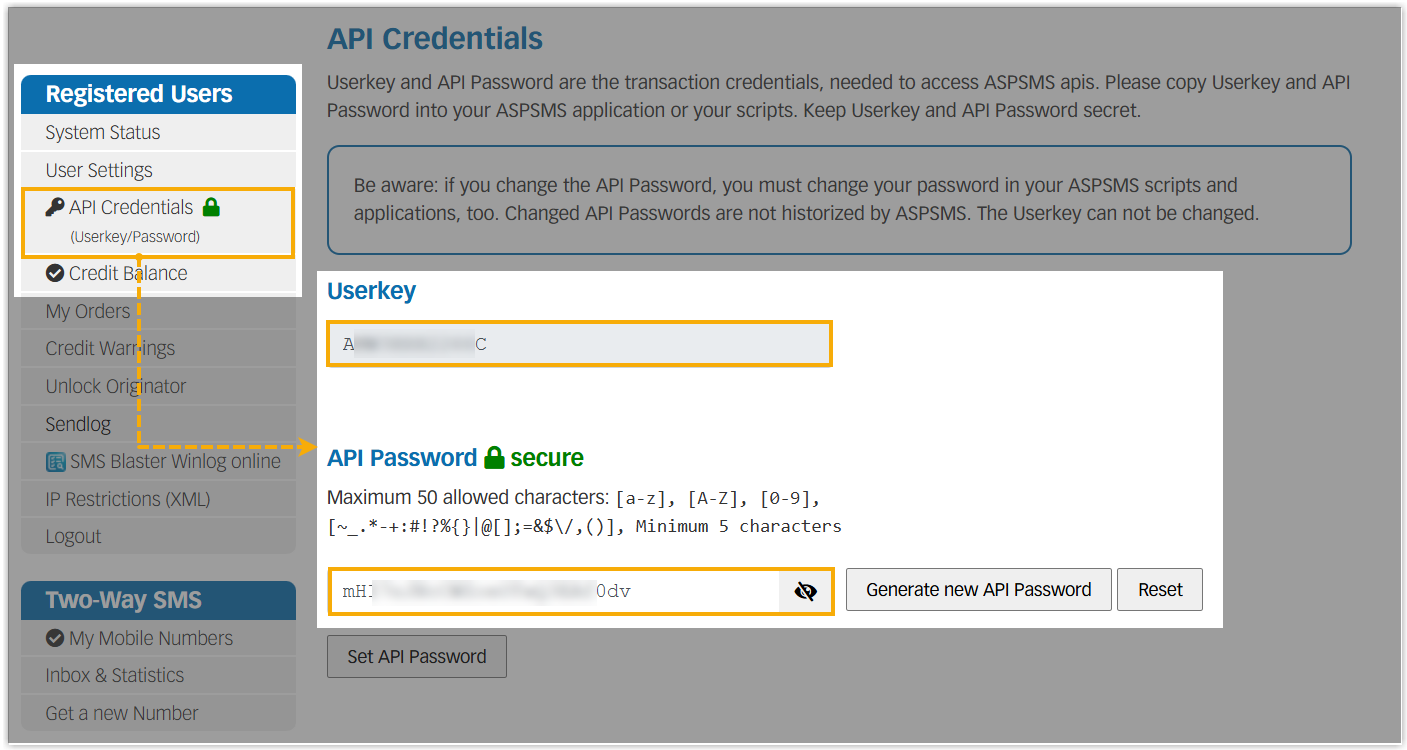 - User Key:粘贴从 Aspsms 获取的 Userkey。