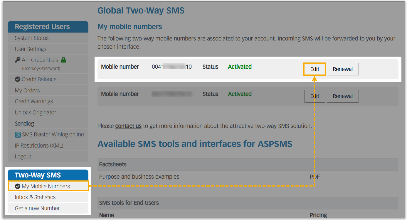 - 在左侧导航栏,进入 ,然后点击号码旁的 Edit。