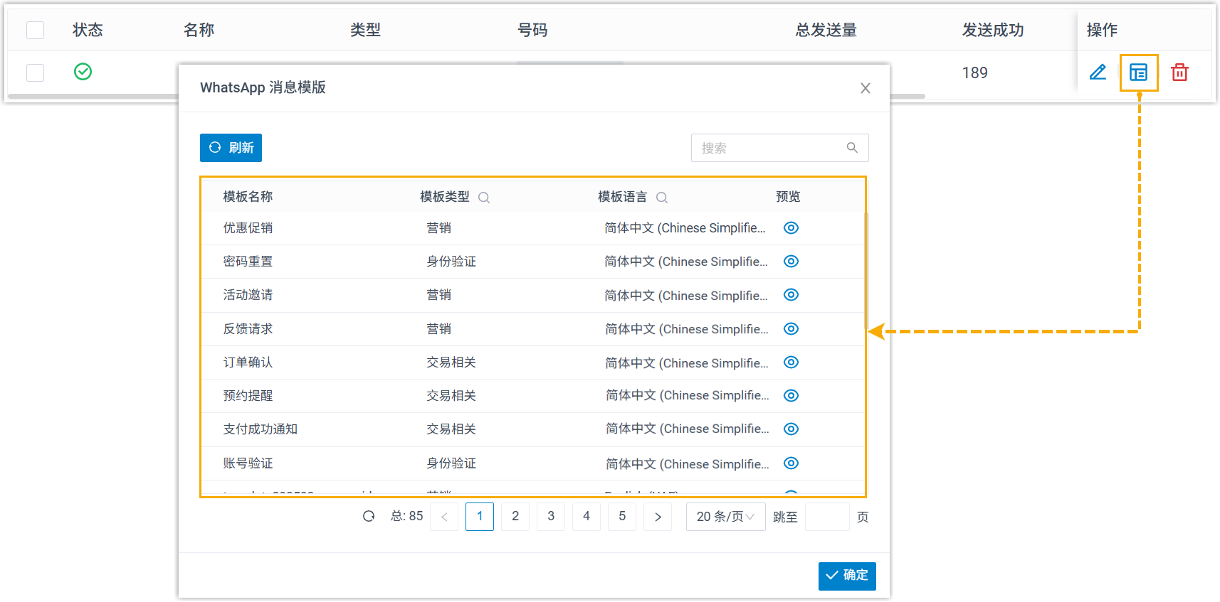 页面会弹出一个窗口,显示与你的 WhatsApp 商业账户关联的所有已同步的消息模板。