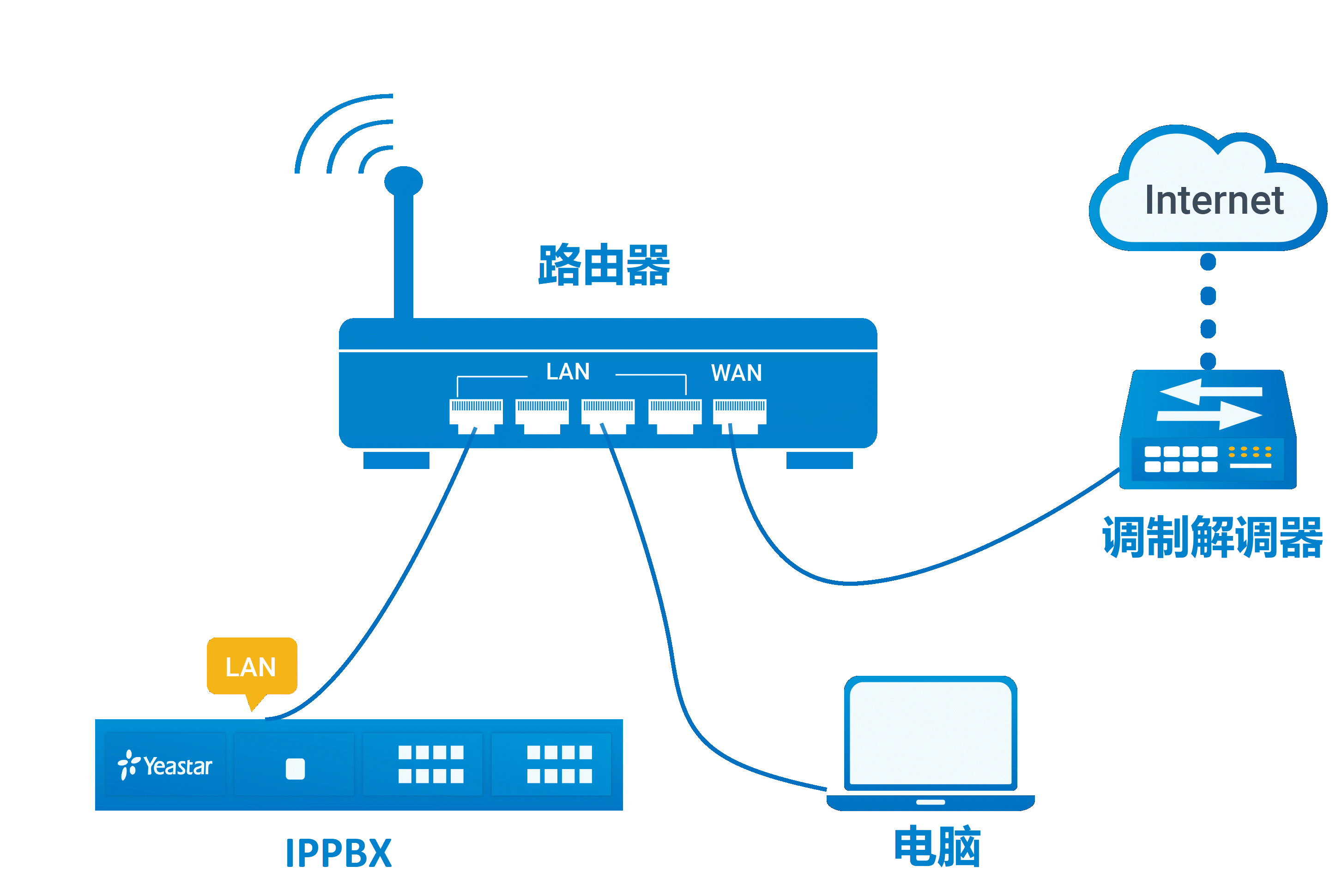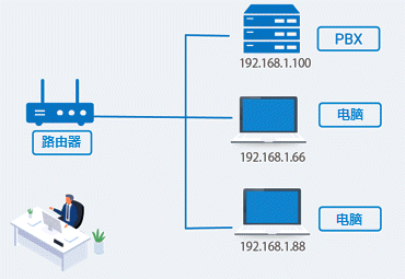 使用网线连接 IPPBX LAN 口和交换机或路由器;电脑也连接到交换机或路由器。