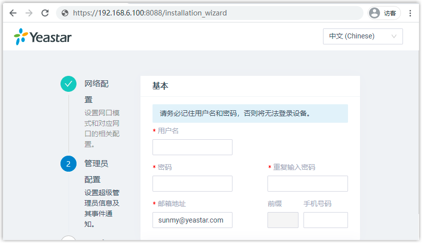 重要提示:谨记用户名和密码,否则你需要重置 IPPBX 设置新的用户名和密码。