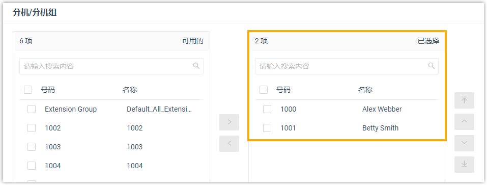 3在 分机 栏,选择 Alex 的分机和 Betty 的分机。