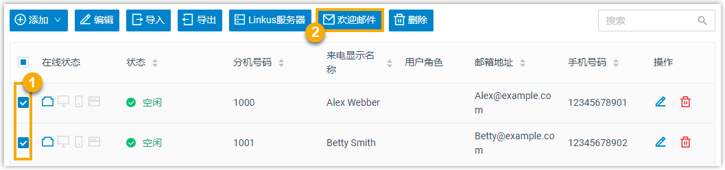 分机是一串虚拟号码。员工可以使用分机号进行内部通话。在本例中,我们为 Alex 和 Betty 创建两个分机号。