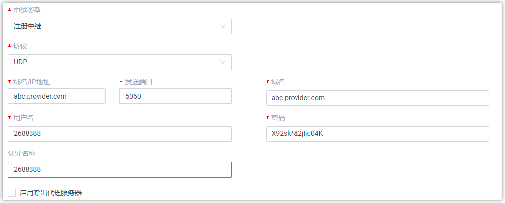 说明:根据运营商提供的中继信息选择相应的中继类型。 更多关于中继类型的信息,请参见 SIP 中继类型.