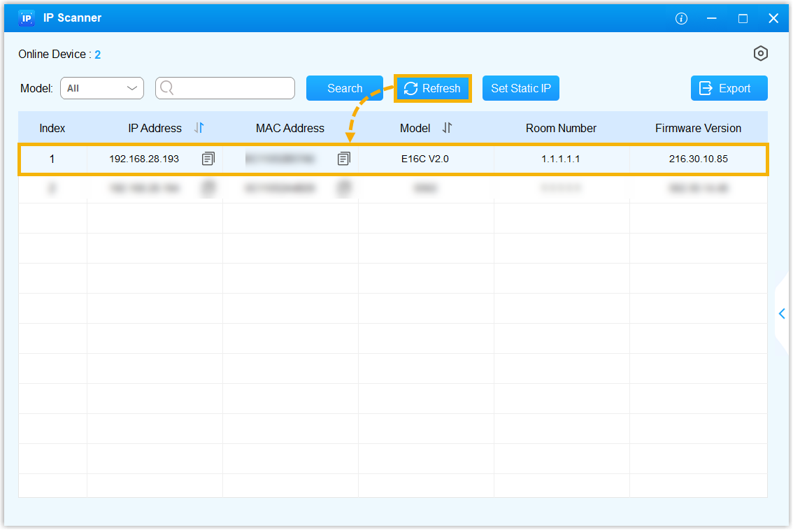 列表中显示扫描到的对讲设备及其 IP 地址。