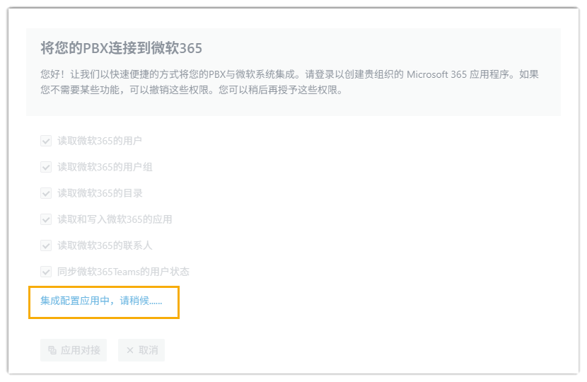 - 查看并配置 Microsoft 365 应用的访问权限,然后点击 应用对接。