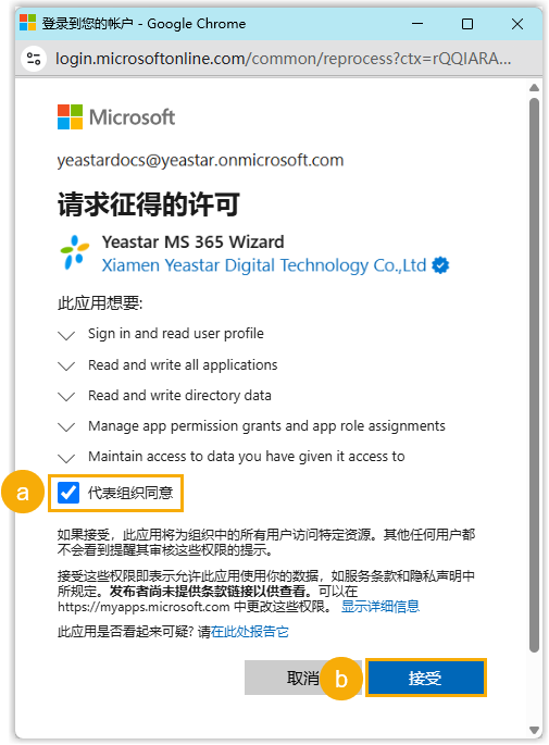 - 在授权窗口中,勾选复选框以授予 Yeastar MS 365 Wizard 所请求的权限,然后点击