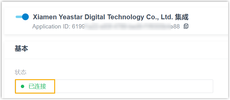 配置应用完成后,连接页面将显示 集成成功。