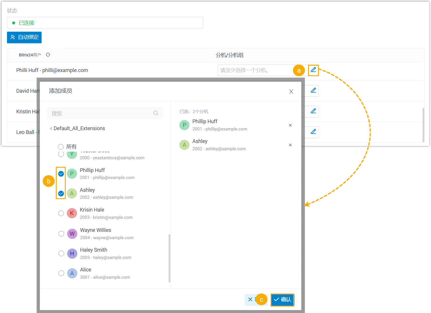 - 绑定 Bitrix24 用户和 PBX 分机.。
