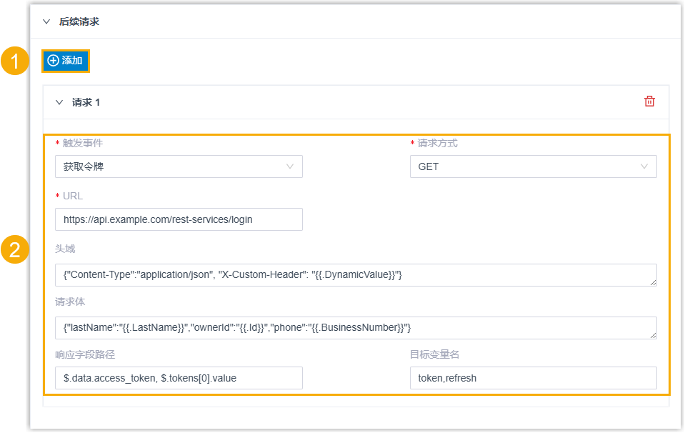 {"lastName":"{{.LastName}}","ownerId":"{{.Id}}","phone":"{{.BusinessNumber}}"}响应字段路径 定义从后续请求响应中提取数据的 JSON 路径。 注: 使用半角逗号,分隔多个路径,如$.data.access_token, $.tokens[0].value。目标变量名 定义用于存储相应中获取的数据的系统变量名称 (可为现有变量或新变量)。 注:- 使用半角逗号