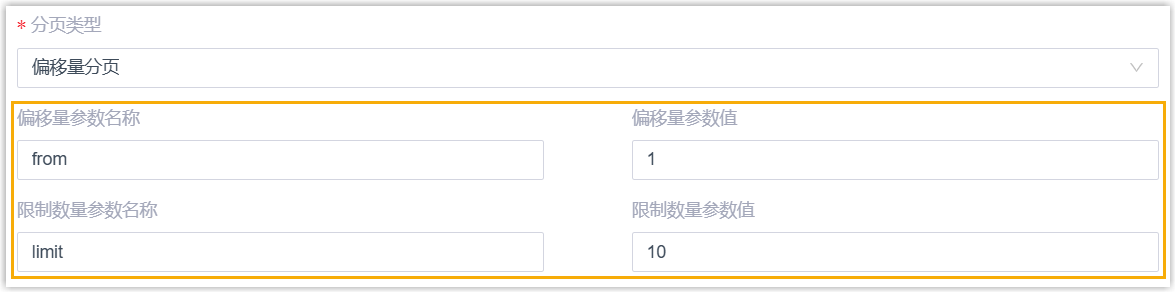 1表示从第 1 条记录开始查询;设为100表示从第 100 条开始查询。 - 限制数量参数名称:填写接口请求中用于指定每页记录数量的参数名称。