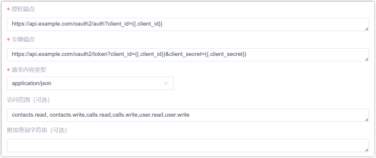 https://www.api.example.com/oauth/v2/token?client_id={{.client_id}}&client_secret={{.client_secret}}请求内容类型 选择令牌获取请求的内容类型。 访问范围 可选。输入允许 PBX 访问的 CRM 数据范围。 注: 使用半角逗号,分隔多个字段。例如,