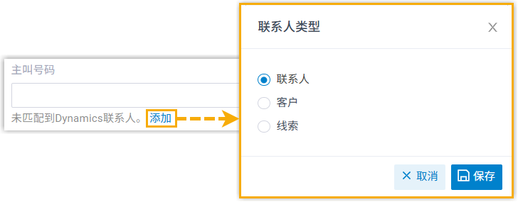 - 主叫号码:自动显示匹配的 Dynamics 联系人。注:
