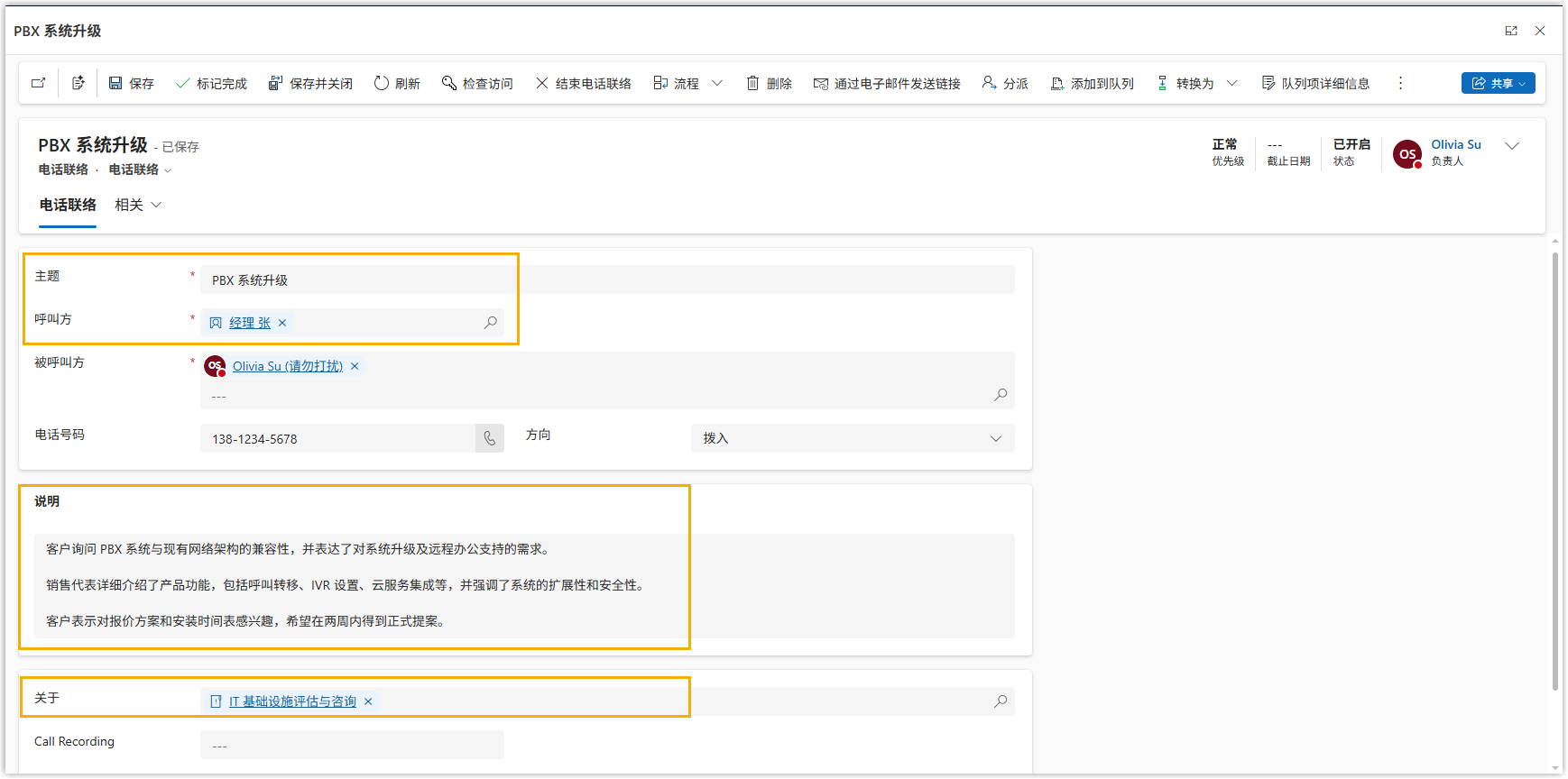 通话活动已更新到 Dynamics 365,并与所选联系人和记录关联。