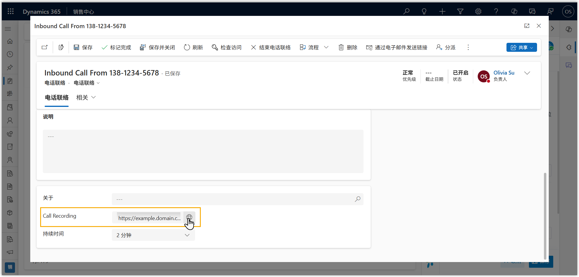 你可以直接在 Dynamics 365 对应的通话活动中查看并播放存储在 PBX 上的通话录音。