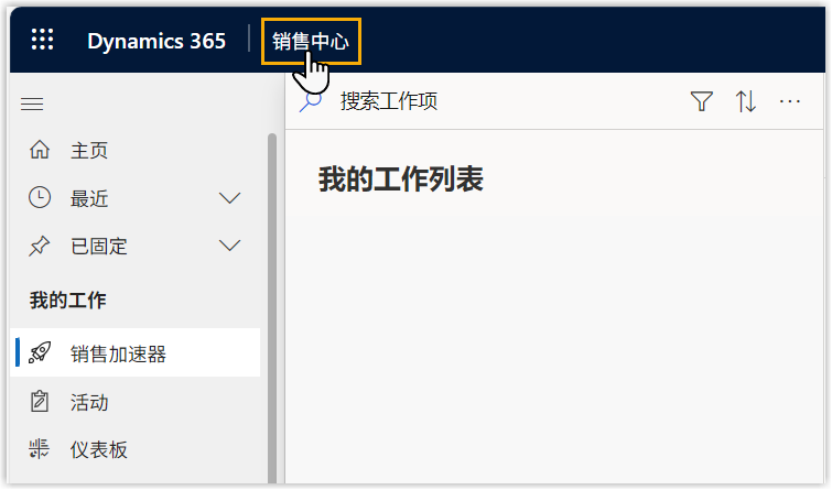 https://{{your-organization}}.crm.dynamics.com)。注: 将 your-organization替换为企业实际的域名。 - 在页面顶部,点击当前应用名称。
