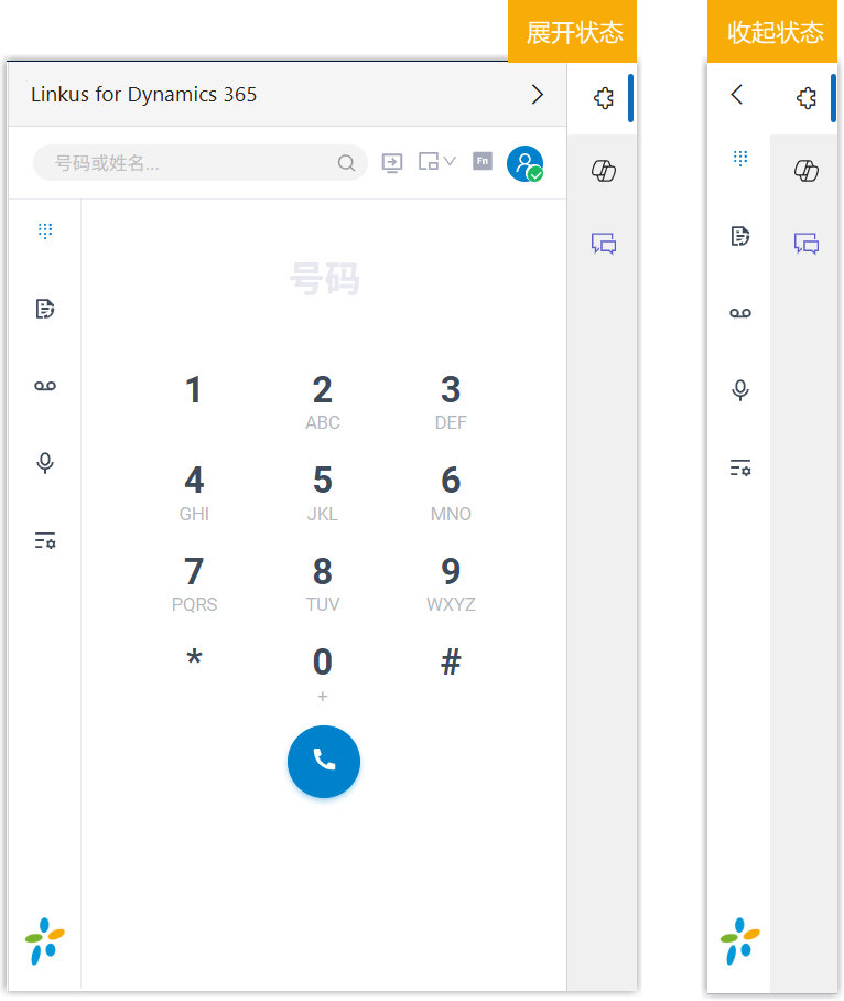 “Linkus for Dynamics 365” 插件提供了精简版的 Linkus 界面,允许用户在 Dynamics 365 中使用通话功能。本文将介绍插件界面,并详细说明对应功能。