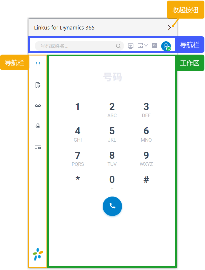 在 Dynamics 365 中通过插件登录分机后,系统会显示一个精简版的 Linkus 界面,其布局如下所示: