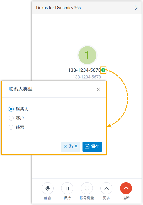 • 联系人:将未知号码保存为 Dynamics 365 的联系人。