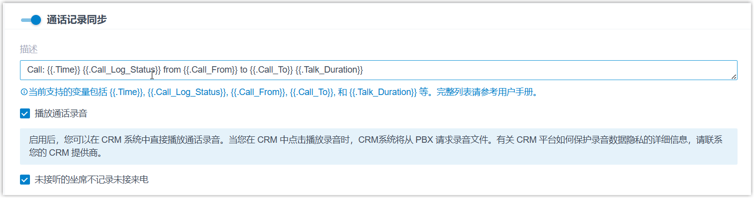 设置 说明 描述 通话记录的描述。 注: 可使用变量组成以上通话记录信息。关于支持的变量,请参见 集成模板 XML 说明 - 通话记录场景变量。播放通话录音 若启用,绑定了 PBX 分机的 CRM 用户可以直接在 CRM 系统中查看并播放存储在 PBX 上的通话录音。