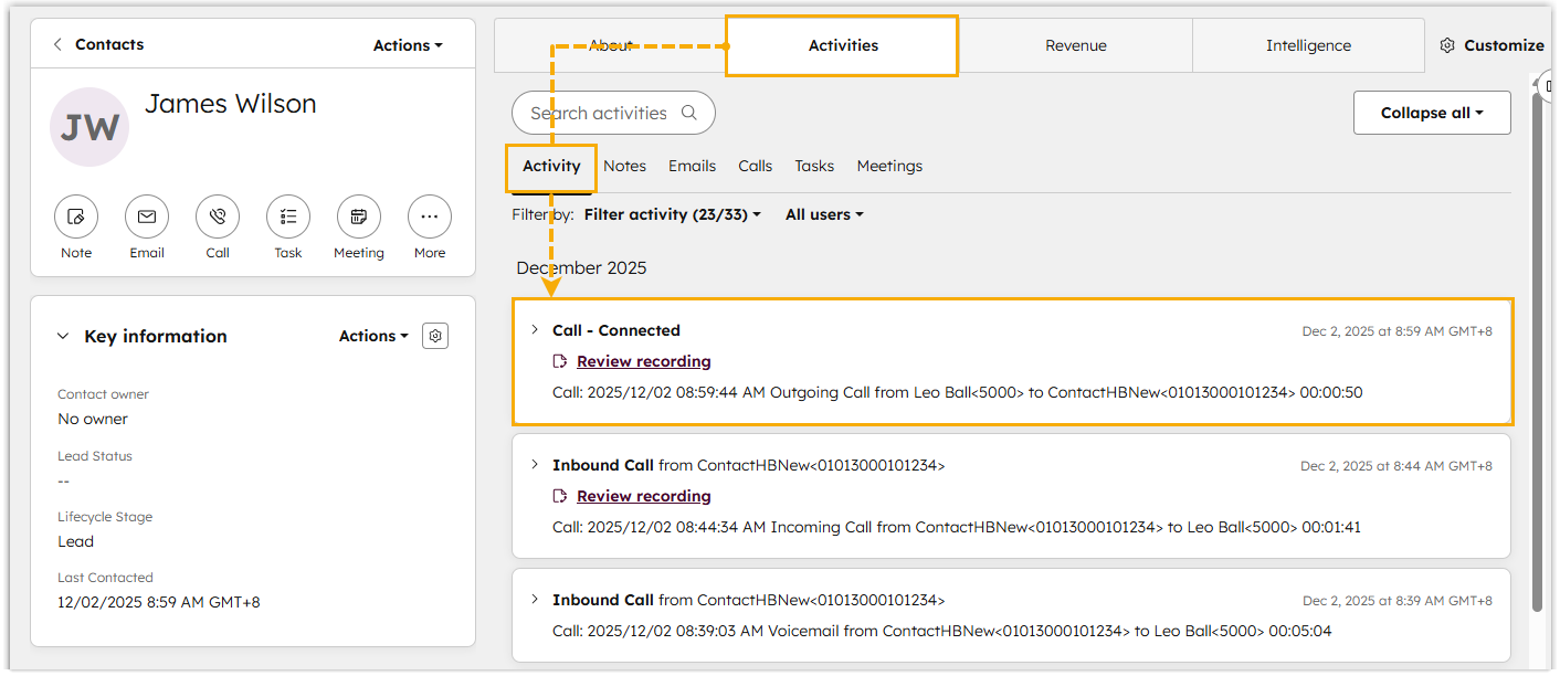 Yeastar P 系列软件版 与 HubSpot CRM 对接后,你可以设置通话记录同步,以自动将用户与联系人的通话活动记录到 CRM 中。