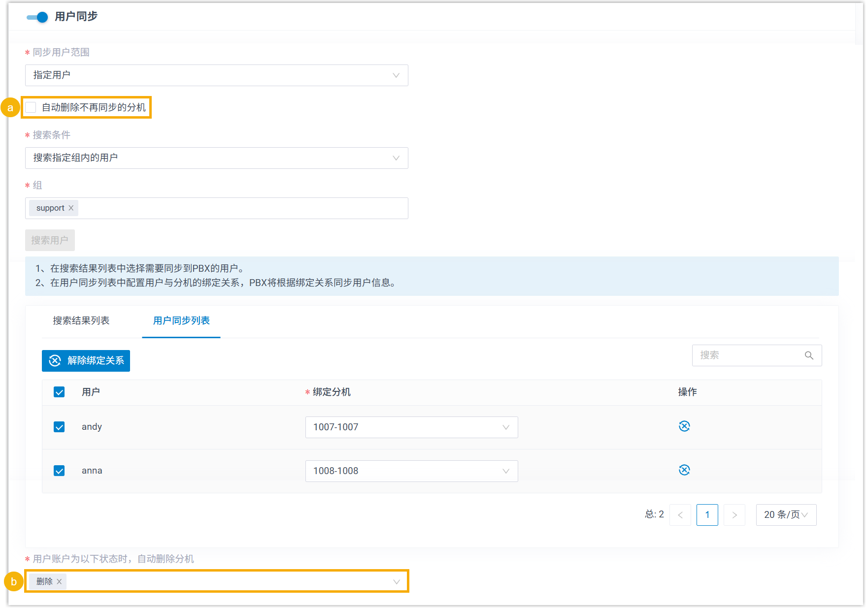 - 在 用户同步列表 中,从下拉列表中选中分机,与该用户绑定。注: 如果你想取消同步已选择的用户,执行以下操作:
