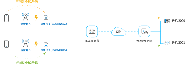 | 运营商 A | 4G 中继 1:13309876523 | 分机 2000 |