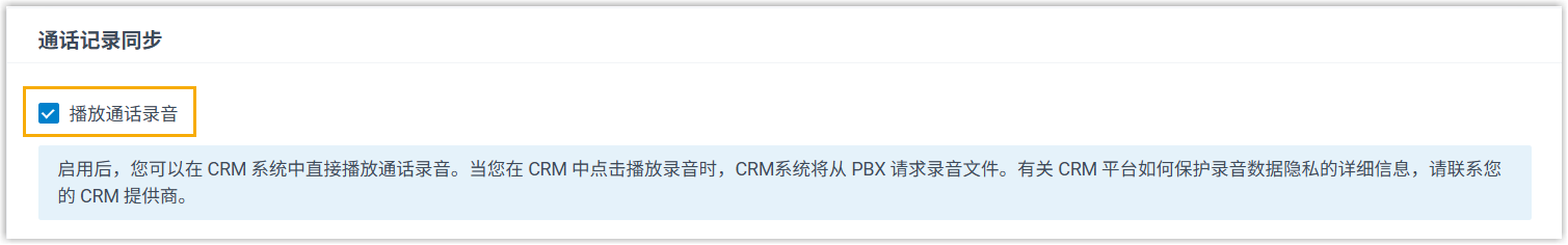 启用后,用户在 CRM 中点击播放通话录音时,系统将会向 PBX 请求录音文件。注: 有关 CRM 平台如何保护录音数据的隐私,请联系你的 CRM 提供商。