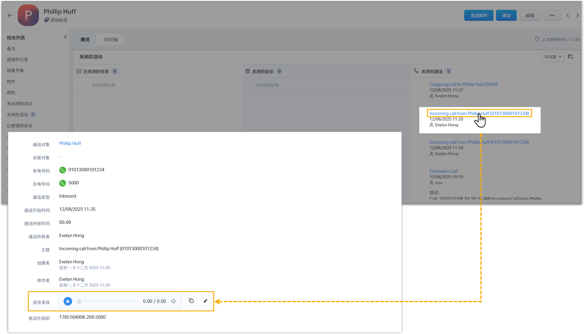 绑定分机的 Zoho CRM 用户可以直接在 CRM 联系人详情页中查看和播放通话录音。