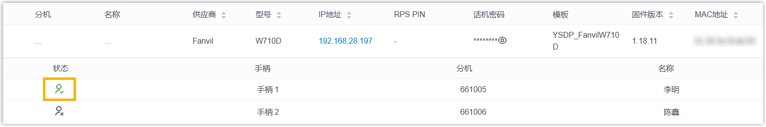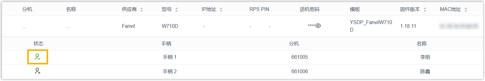 - 在 PBX 管理网页中,可在 中查看分机的注册状态。