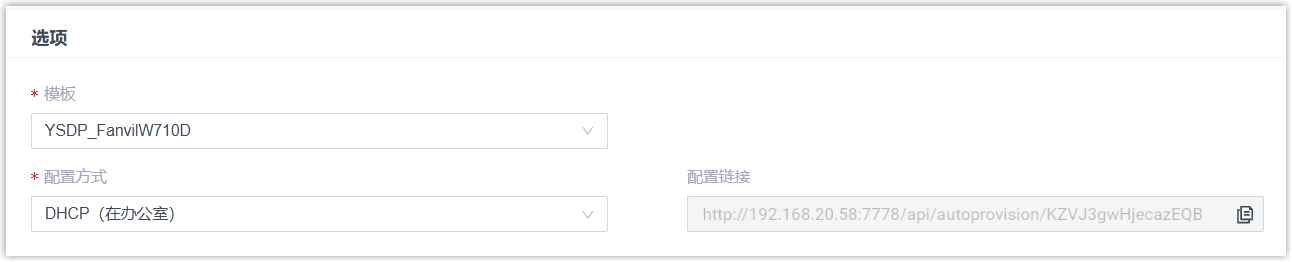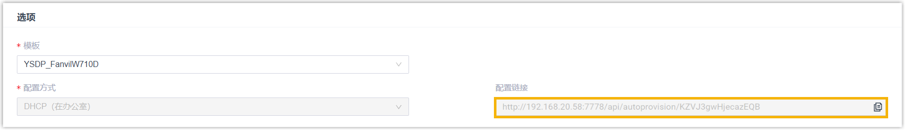 - 在 DECT 系统所在网段的 DHCP 服务器上,使用 PBX 上生成的配置链接,配置 DHCP option 66。