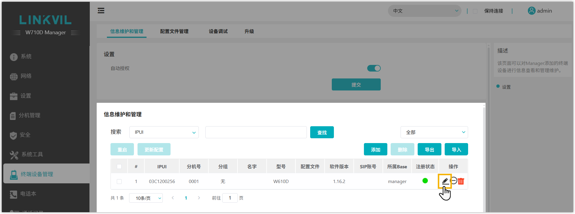 - 登录 PBX 管理网页,进入 ,编辑此分机。